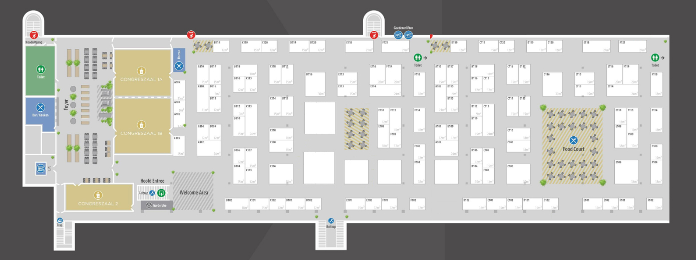 Hieronder zie je een voorbeeld van de beursvloer bij maximale bezetting in de NextLevel hal (van de Evenementenhal Gorinchem). Aan dit voorbeeld kunnen geen rechten worden ontleend, de organisatie is vrij in het indelen van de beurs naar haar eigen inzicht. Medio 2026 zal deze plattegrond worden ingevuld met gereserveerde plekken en een overzicht van standhouders.